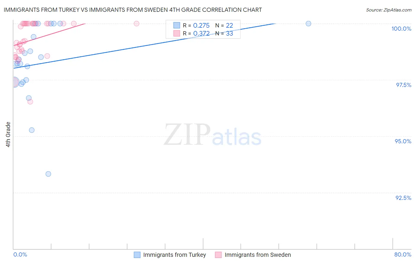Immigrants from Turkey vs Immigrants from Sweden 4th Grade Correlation Chart