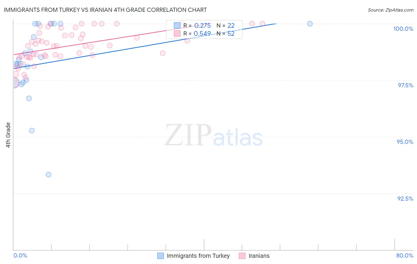 Immigrants from Turkey vs Iranian 4th Grade Correlation Chart