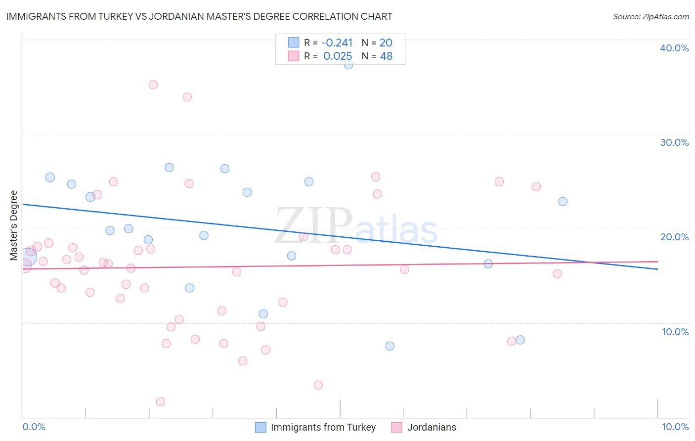 The statistical analysis conducted on geographies consisting of 223,018,840 people shows a weak negative correlation between the proportion of Immigrants from Turkey and percentage of population with at least master's degree education in the United States with a correlation coefficient (R) of -0.241 and weighted average of 19.7%. Similarly, the statistical analysis conducted on geographies consisting of 166,405,589 people shows no correlation between the proportion of Jordanians and percentage of population with at least master's degree education in the United States with a correlation coefficient (R) of 0.025 and weighted average of 16.5%, a difference of 19.4%.