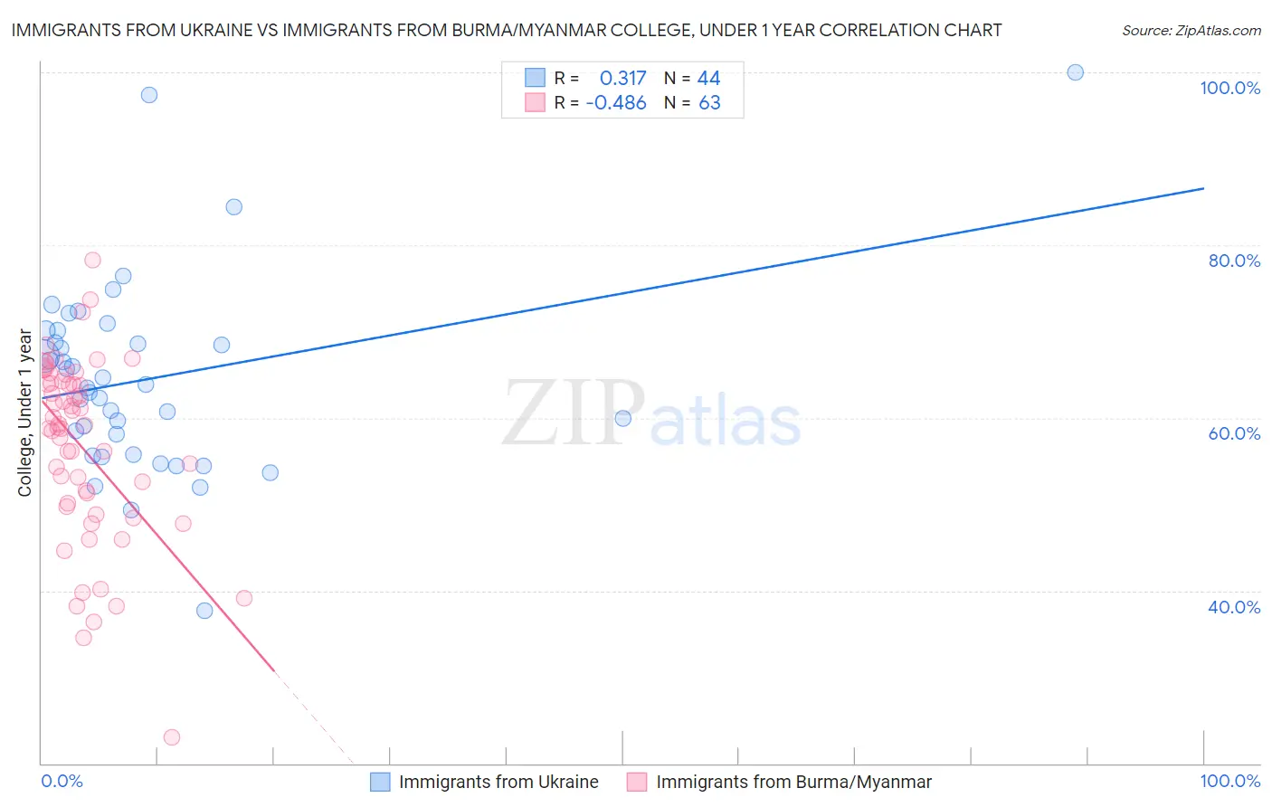 Immigrants from Ukraine vs Immigrants from Burma/Myanmar College, Under 1 year Correlation Chart