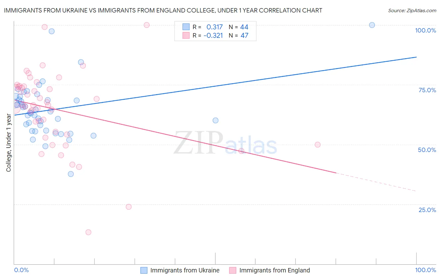 Immigrants from Ukraine vs Immigrants from England College, Under 1 year Correlation Chart