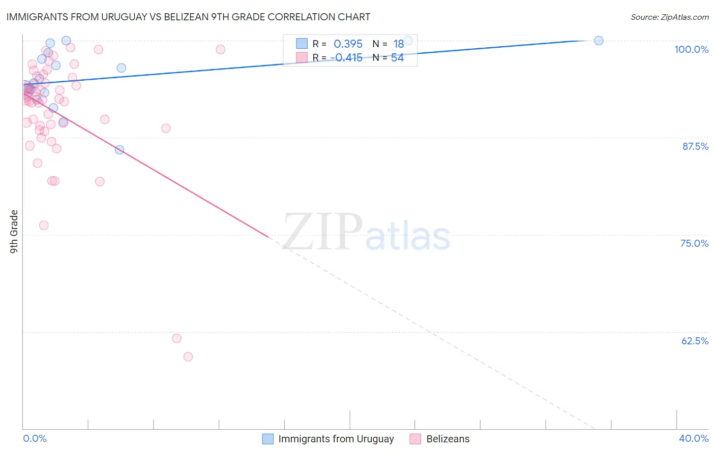 Immigrants from Uruguay vs Belizean 9th Grade Correlation Chart