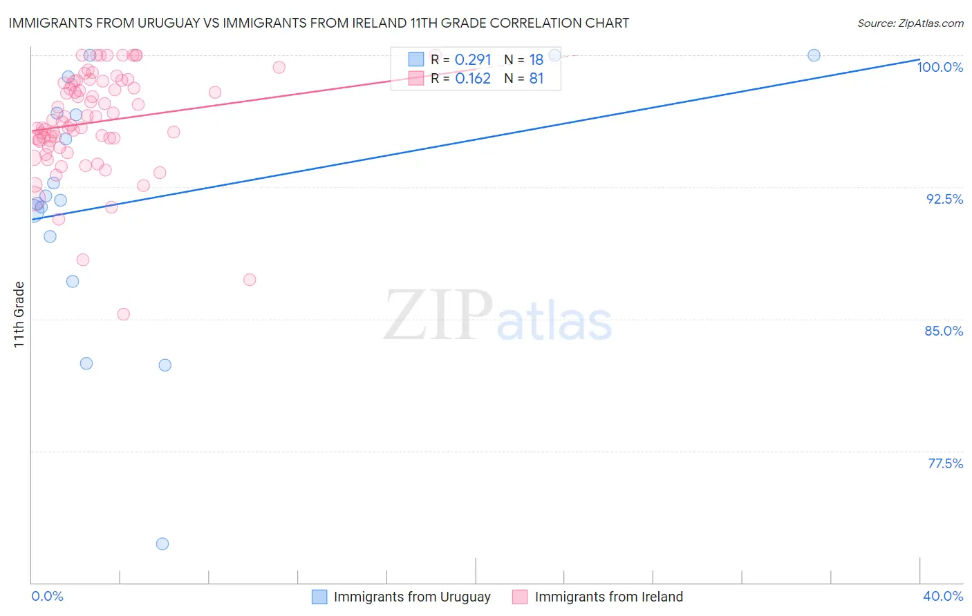 Immigrants from Uruguay vs Immigrants from Ireland 11th Grade Correlation Chart