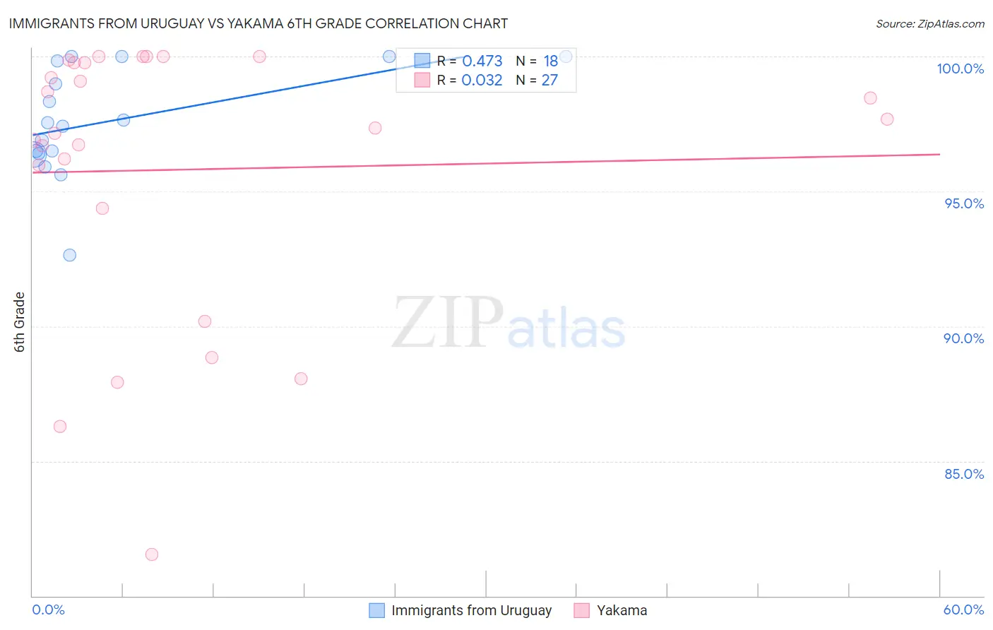 Immigrants from Uruguay vs Yakama 6th Grade Correlation Chart