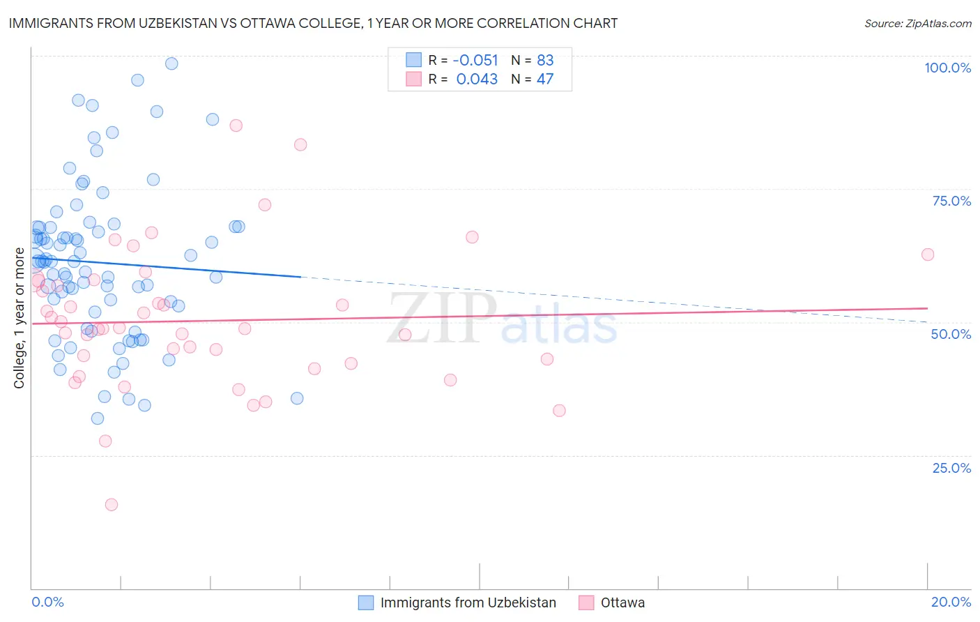 Immigrants from Uzbekistan vs Ottawa College, 1 year or more Correlation Chart