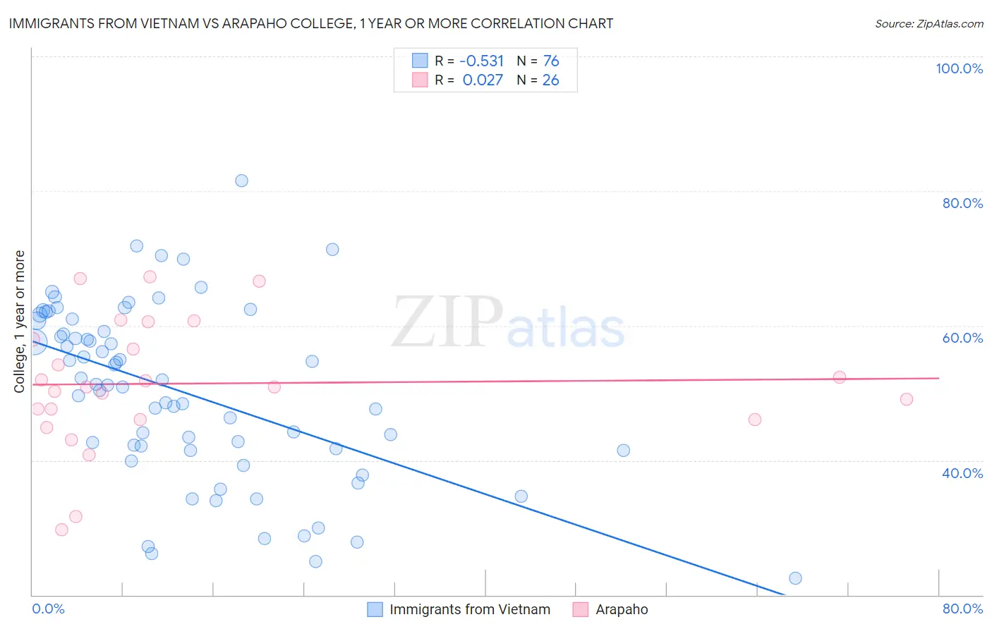 Immigrants from Vietnam vs Arapaho College, 1 year or more Correlation Chart
