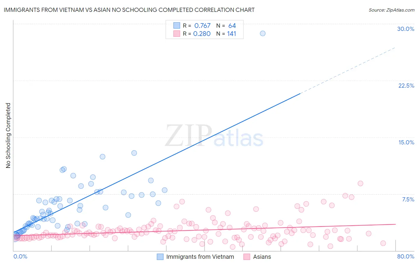 Immigrants from Vietnam vs Asian No Schooling Completed Correlation Chart