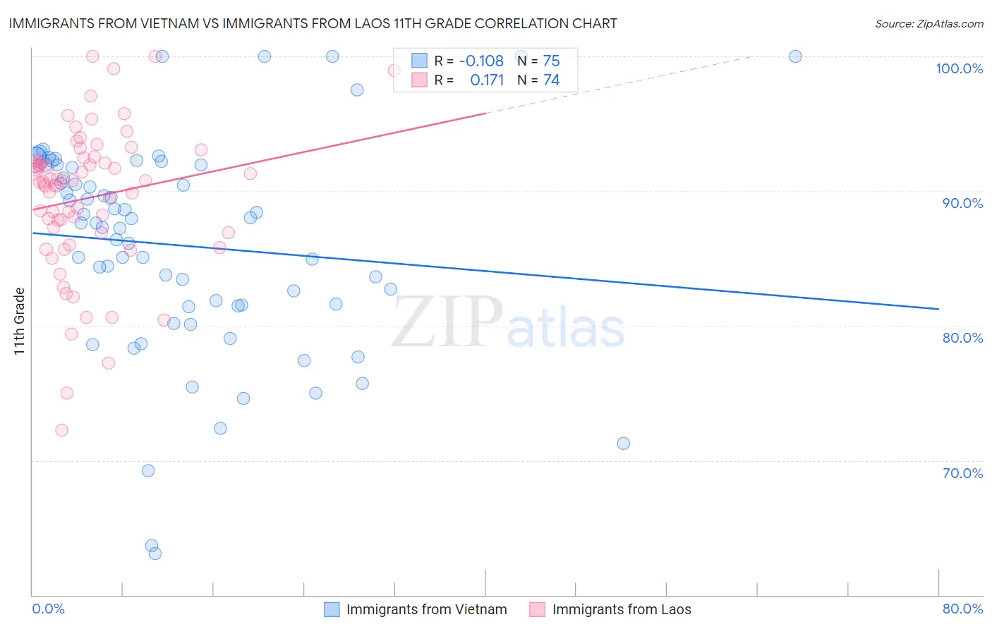 In terms of 11th grade, the demographic groups most similar to Immigrants from Vietnam are Fijian (90.0%, a difference of 0.020%), Navajo (90.0%, a difference of 0.060%), Immigrants from Grenada (90.1%, a difference of 0.11%), Immigrants from Fiji (89.9%, a difference of 0.13%), and Native/Alaskan (90.2%, a difference of 0.15%). Similarly, the demographic groups most similar to Immigrants from Laos are Immigrants from Burma/Myanmar (90.4%, a difference of 0.090%), Immigrants from West Indies (90.4%, a difference of 0.14%), Apache (90.4%, a difference of 0.15%), Immigrants from Barbados (90.7%, a difference of 0.17%), and Pennsylvania German (90.3%, a difference of 0.17%).