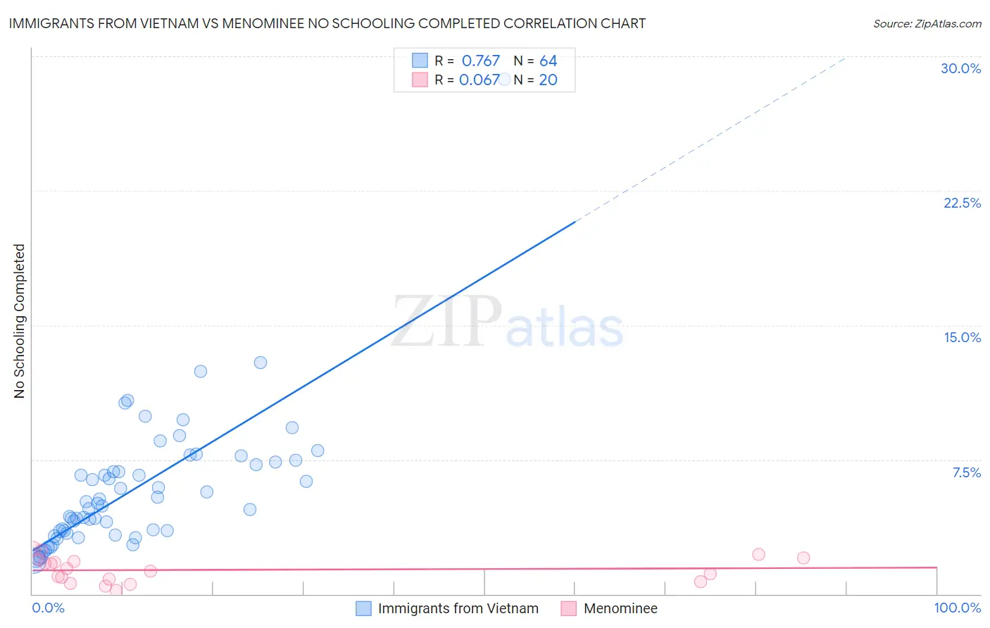 Immigrants from Vietnam vs Menominee No Schooling Completed Correlation Chart
