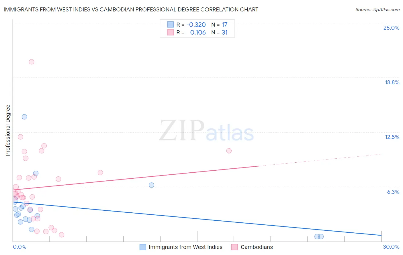 Immigrants from West Indies vs Cambodian Professional Degree Correlation Chart