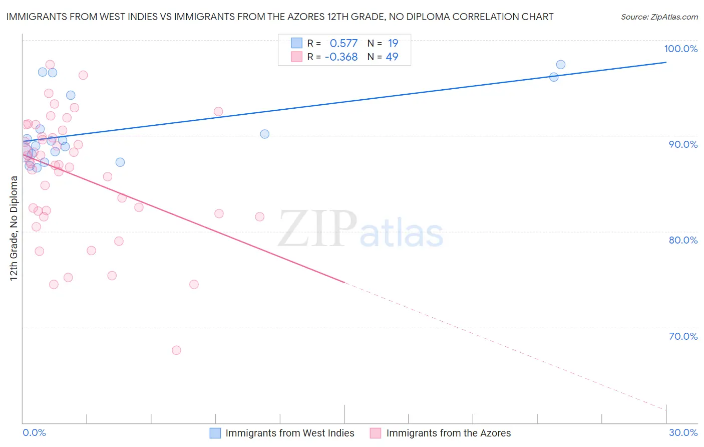 Immigrants from West Indies vs Immigrants from the Azores 12th Grade, No Diploma Correlation Chart