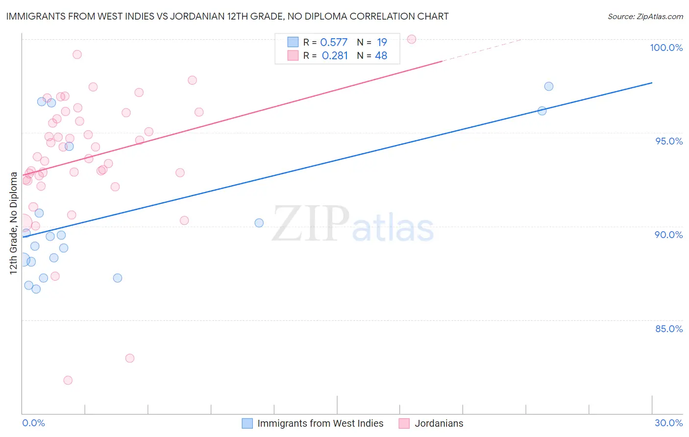 Immigrants from West Indies vs Jordanian 12th Grade, No Diploma Correlation Chart