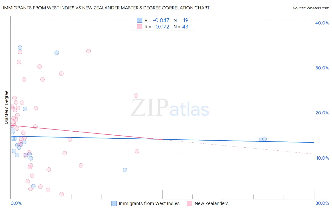 The statistical analysis conducted on geographies consisting of 72,456,461 people shows no correlation between the proportion of Immigrants from West Indies and percentage of population with at least master's degree education in the United States with a correlation coefficient (R) of -0.047 and weighted average of 13.9%. Similarly, the statistical analysis conducted on geographies consisting of 106,899,684 people shows a slight negative correlation between the proportion of New Zealanders and percentage of population with at least master's degree education in the United States with a correlation coefficient (R) of -0.072 and weighted average of 18.3%, a difference of 31.8%.