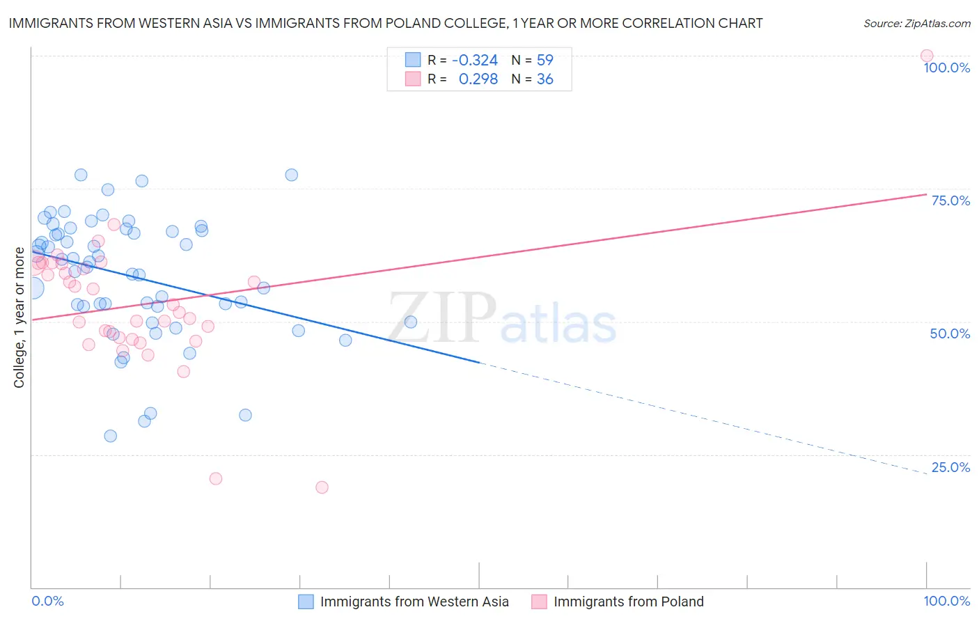 Immigrants from Western Asia vs Immigrants from Poland College, 1 year or more Correlation Chart