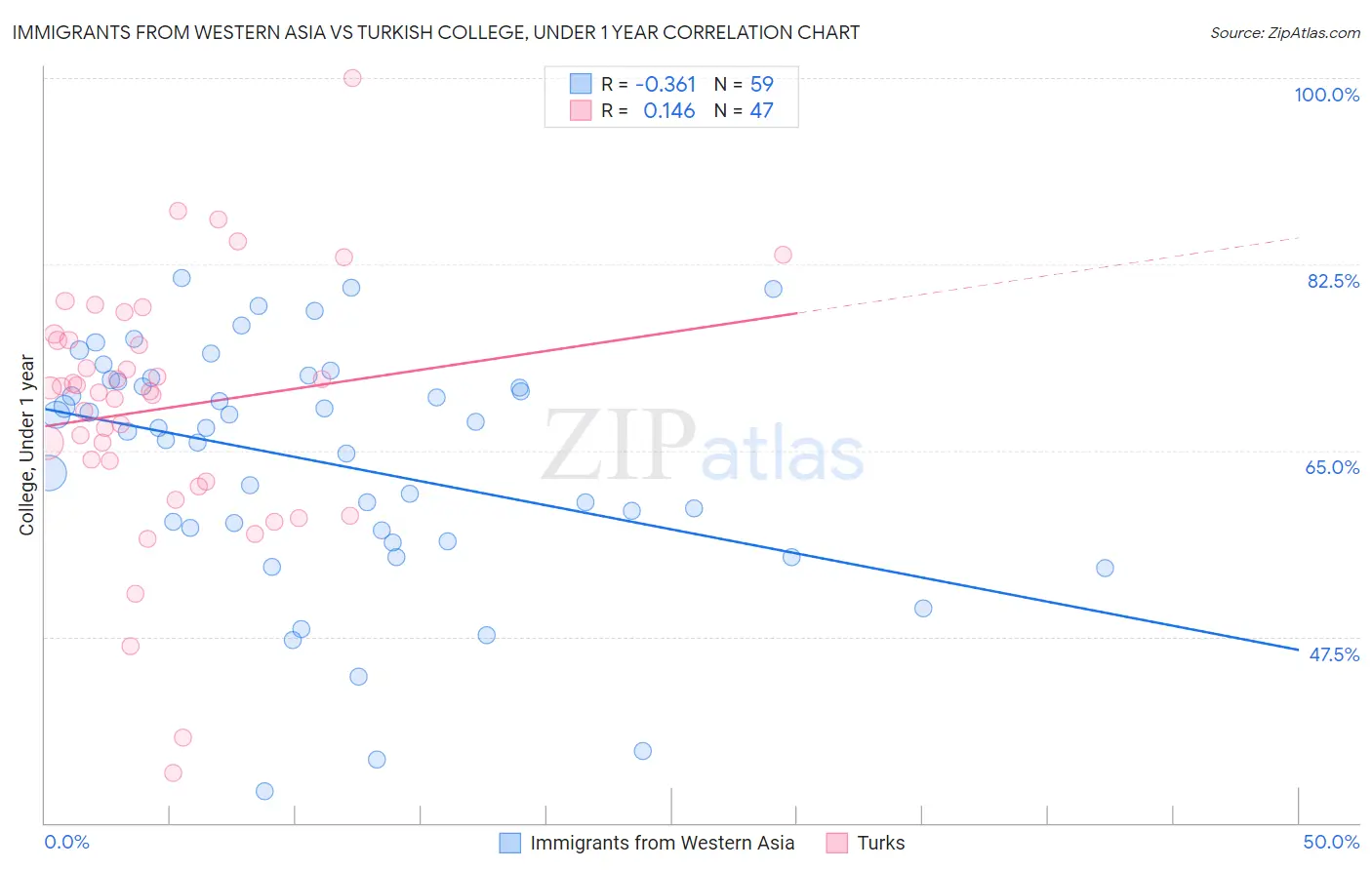 Immigrants from Western Asia vs Turkish College, Under 1 year Correlation Chart