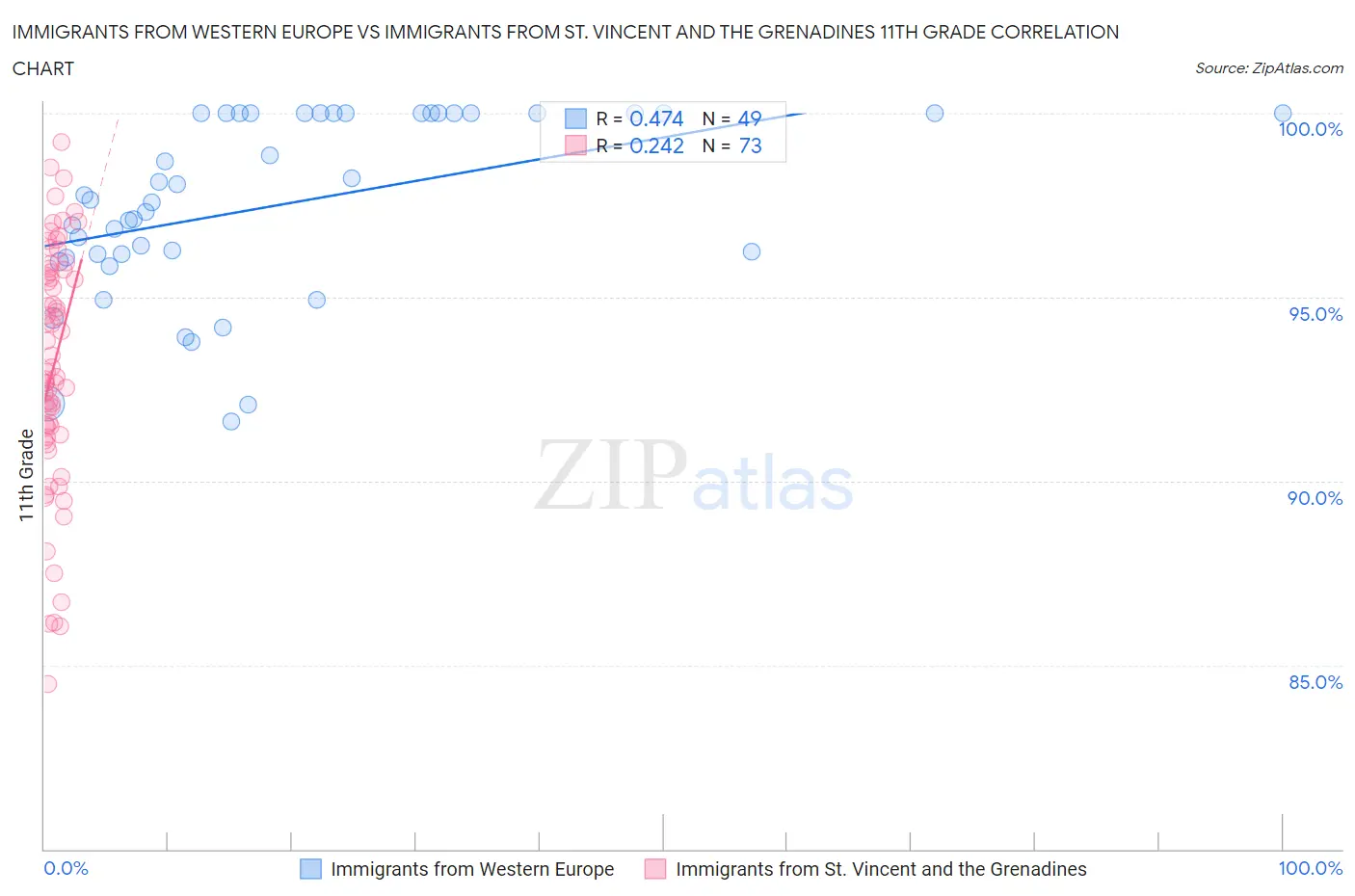 Immigrants from Western Europe vs Immigrants from St. Vincent and the Grenadines 11th Grade Correlation Chart
