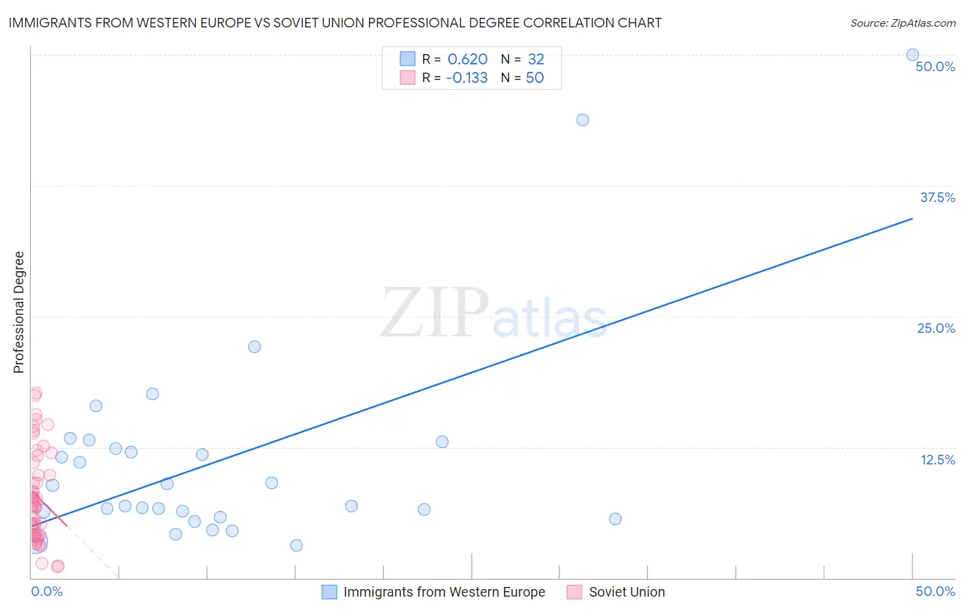 Immigrants from Western Europe vs Soviet Union Professional Degree Correlation Chart