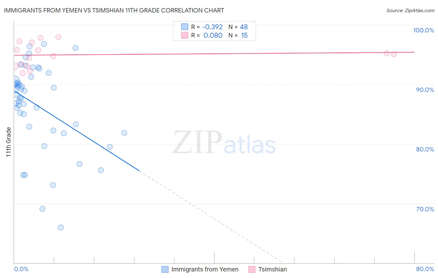 Immigrants from Yemen vs Tsimshian 11th Grade Correlation Chart