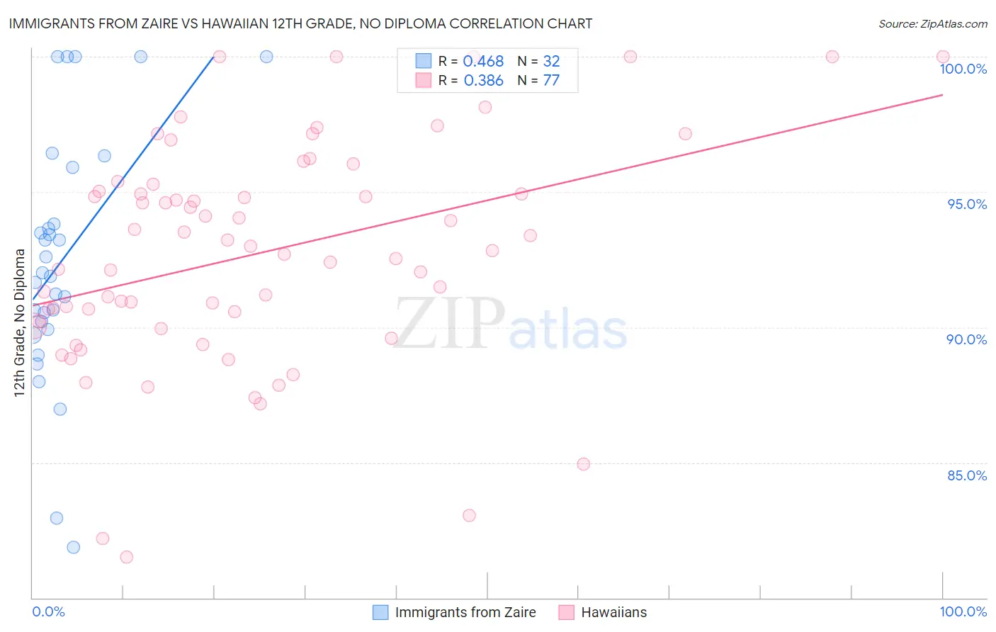Immigrants from Zaire vs Hawaiian 12th Grade, No Diploma Correlation Chart