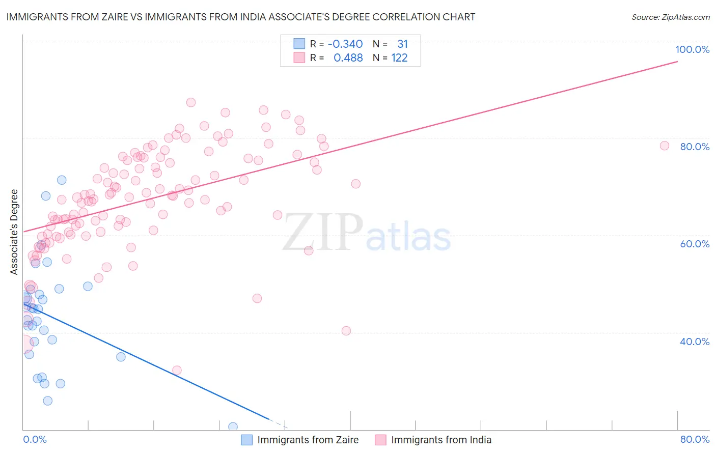 Immigrants from Zaire vs Immigrants from India Associate's Degree Correlation Chart