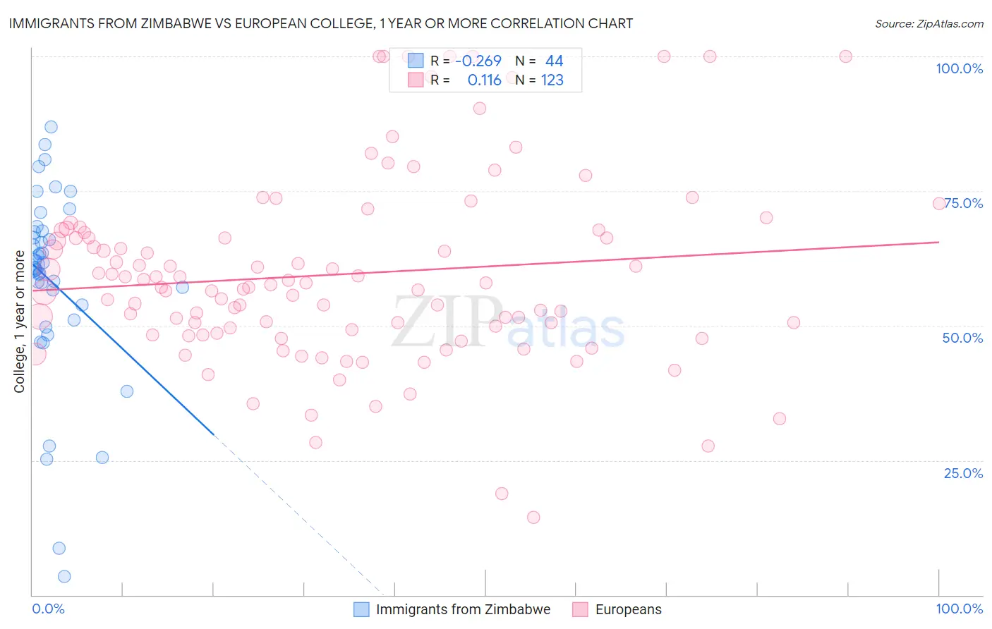 Immigrants from Zimbabwe vs European College, 1 year or more Correlation Chart