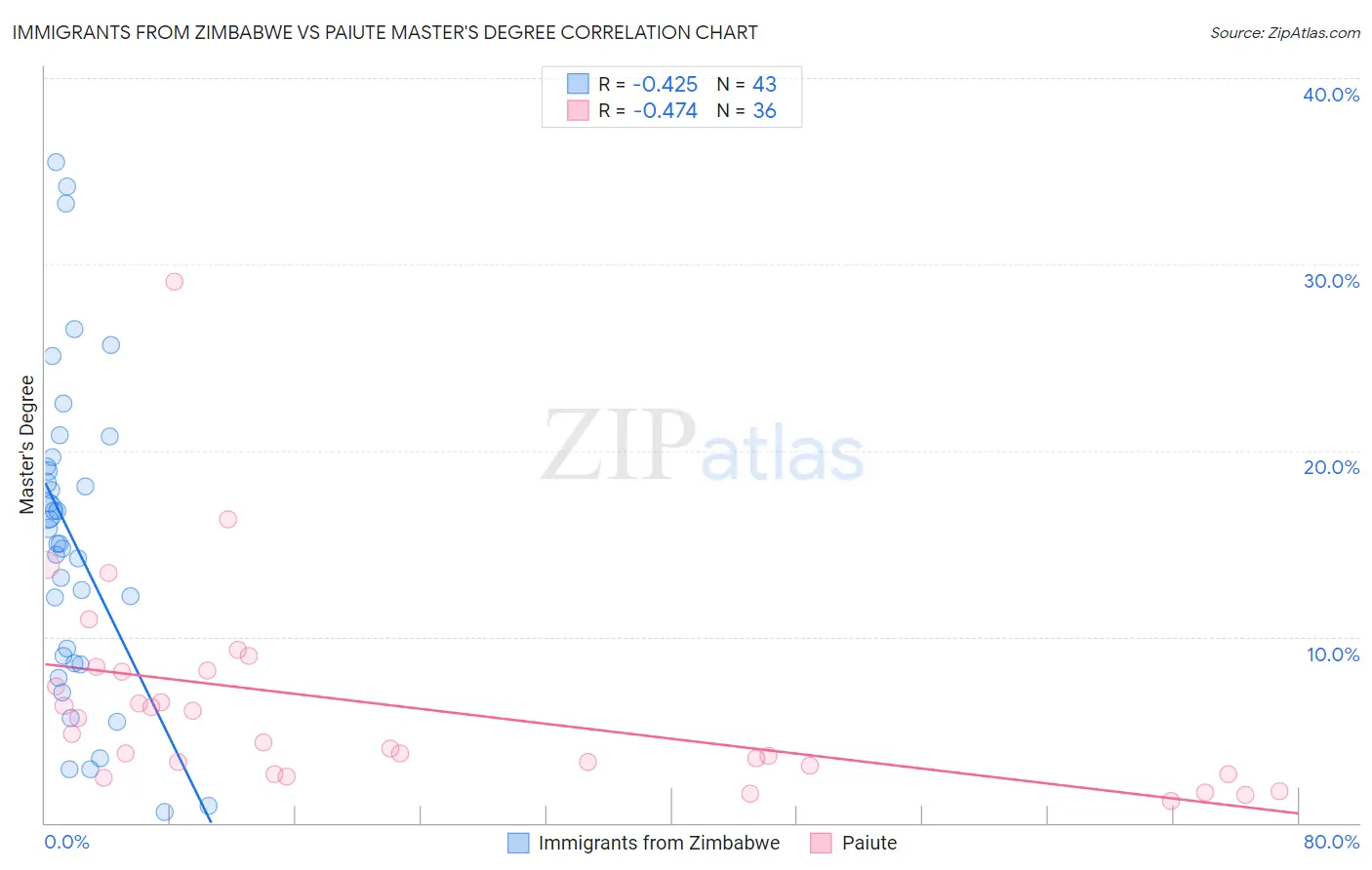 Immigrants from Zimbabwe vs Paiute Master's Degree Correlation Chart