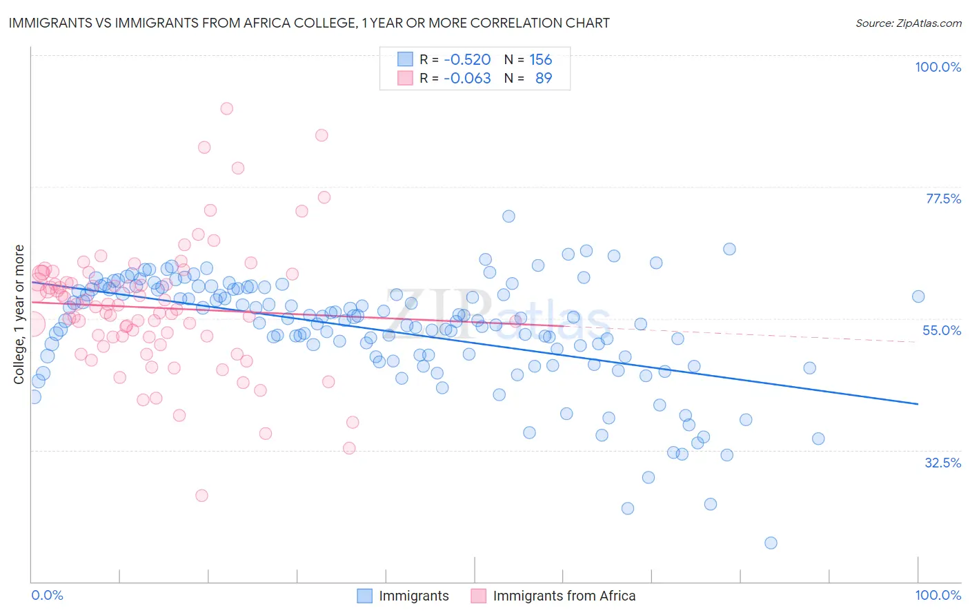 Immigrants vs Immigrants from Africa College, 1 year or more Correlation Chart