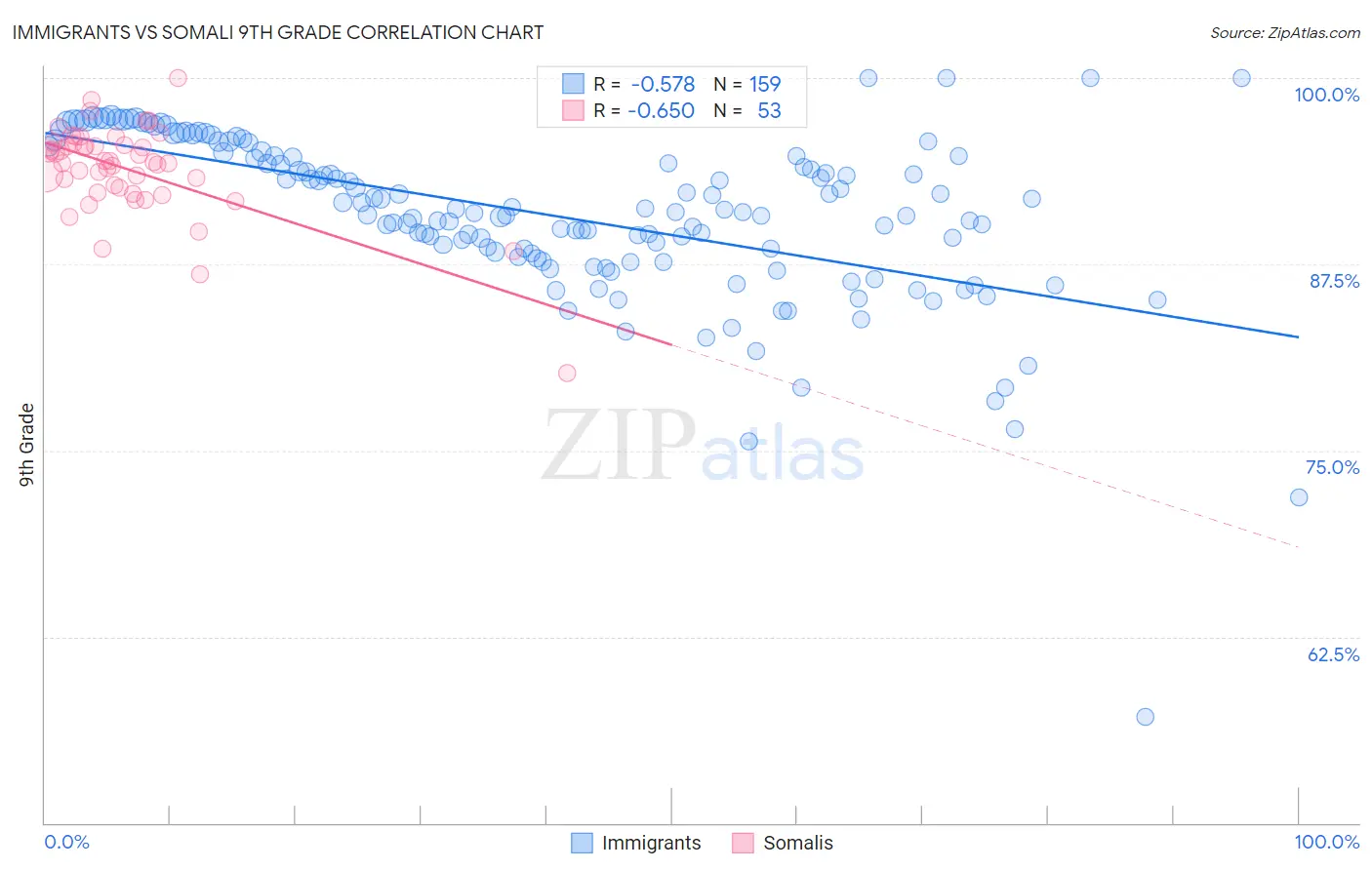 In terms of 9th grade, the demographic groups most similar to Somalis are Korean (94.3%, a difference of 0.0%), South American Indian (94.3%, a difference of 0.010%), Immigrants from China (94.3%, a difference of 0.010%), Bolivian (94.3%, a difference of 0.020%), and Immigrants from Ethiopia (94.3%, a difference of 0.020%).