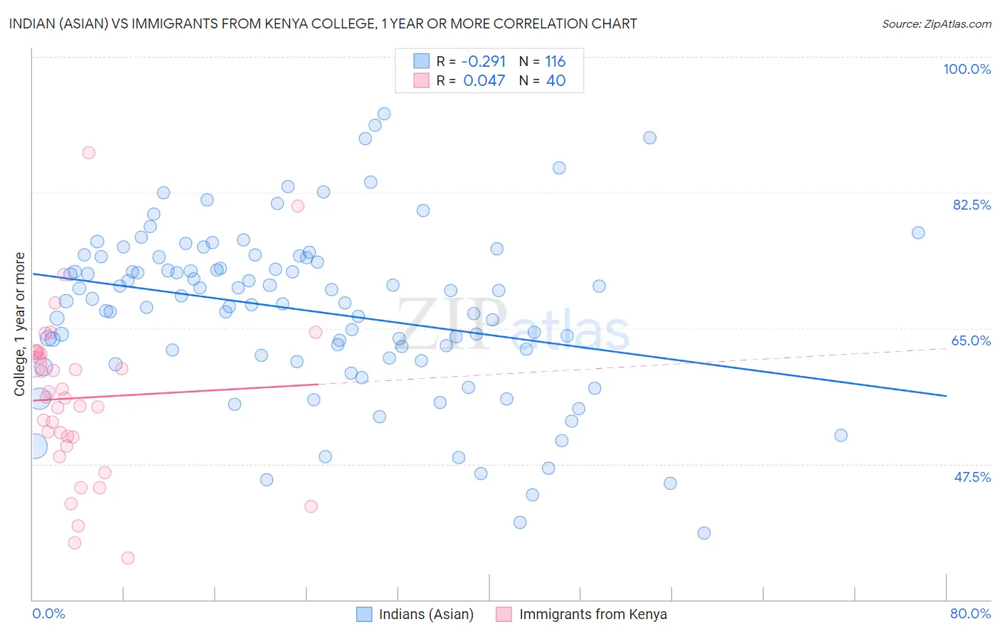 Indian (Asian) vs Immigrants from Kenya College, 1 year or more
