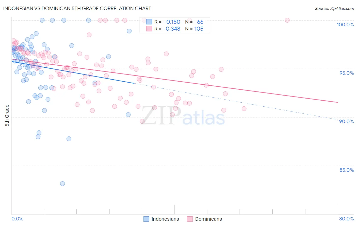 In terms of 5th grade, the demographic groups most similar to Indonesians are Immigrants from Bangladesh (96.0%, a difference of 0.020%), Immigrants from Guyana (96.0%, a difference of 0.040%), Ecuadorian (96.0%, a difference of 0.050%), Vietnamese (95.9%, a difference of 0.050%), and Bangladeshi (95.9%, a difference of 0.070%). Similarly, the demographic groups most similar to Dominicans are Immigrants from Cambodia (95.5%, a difference of 0.0%), Honduran (95.6%, a difference of 0.030%), Hispanic or Latino (95.6%, a difference of 0.030%), Cape Verdean (95.5%, a difference of 0.030%), and Immigrants from Fiji (95.6%, a difference of 0.050%).