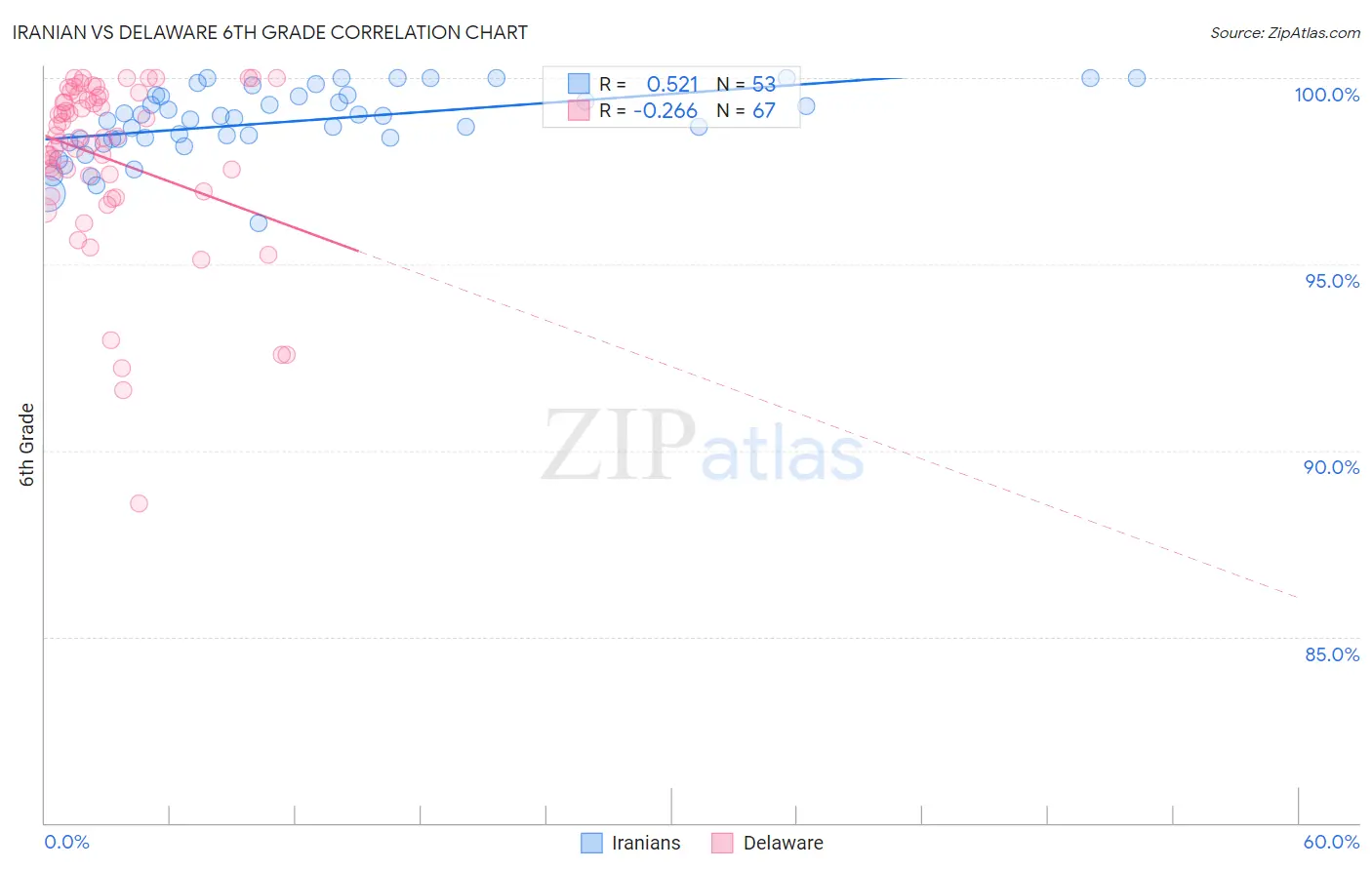 In terms of 6th grade, the demographic groups most similar to Iranians are Cajun (97.6%, a difference of 0.010%), Kiowa (97.7%, a difference of 0.020%), Immigrants from Austria (97.7%, a difference of 0.020%), Chickasaw (97.6%, a difference of 0.020%), and Macedonian (97.6%, a difference of 0.030%). Similarly, the demographic groups most similar to Delaware are Shoshone (97.6%, a difference of 0.010%), Immigrants from Belgium (97.5%, a difference of 0.010%), Puget Sound Salish (97.5%, a difference of 0.010%), Zimbabwean (97.6%, a difference of 0.020%), and Potawatomi (97.6%, a difference of 0.020%).