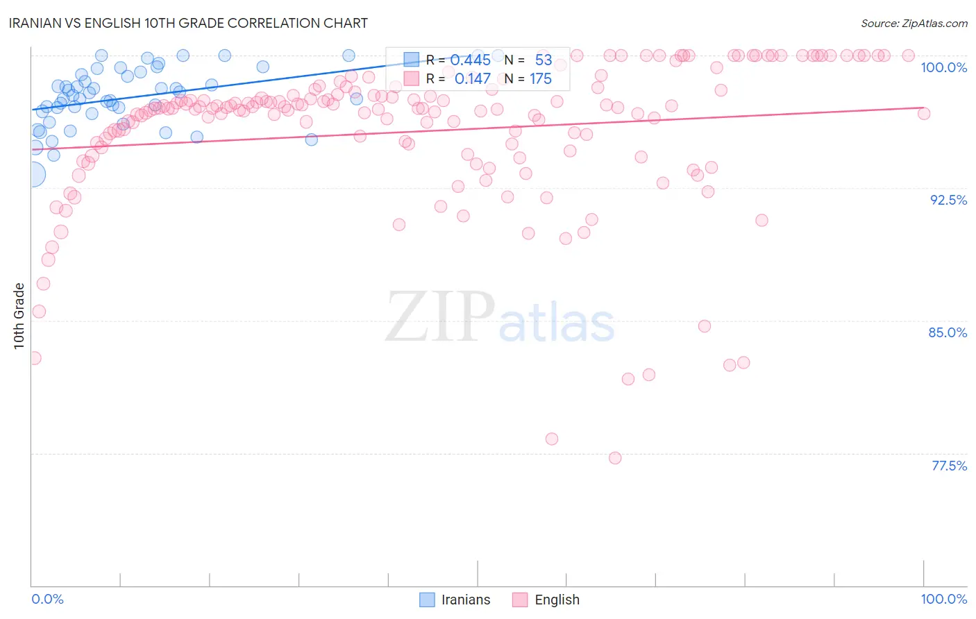 In terms of 10th grade, the demographic groups most similar to Iranians are Hungarian (95.3%, a difference of 0.0%), Belgian (95.4%, a difference of 0.020%), Bulgarian (95.4%, a difference of 0.070%), Alaskan Athabascan (95.4%, a difference of 0.11%), and Luxembourger (95.4%, a difference of 0.11%). Similarly, the demographic groups most similar to English are Tsimshian (95.6%, a difference of 0.010%), Irish (95.6%, a difference of 0.030%), Tlingit-Haida (95.7%, a difference of 0.040%), Scottish (95.6%, a difference of 0.040%), and Latvian (95.6%, a difference of 0.050%).