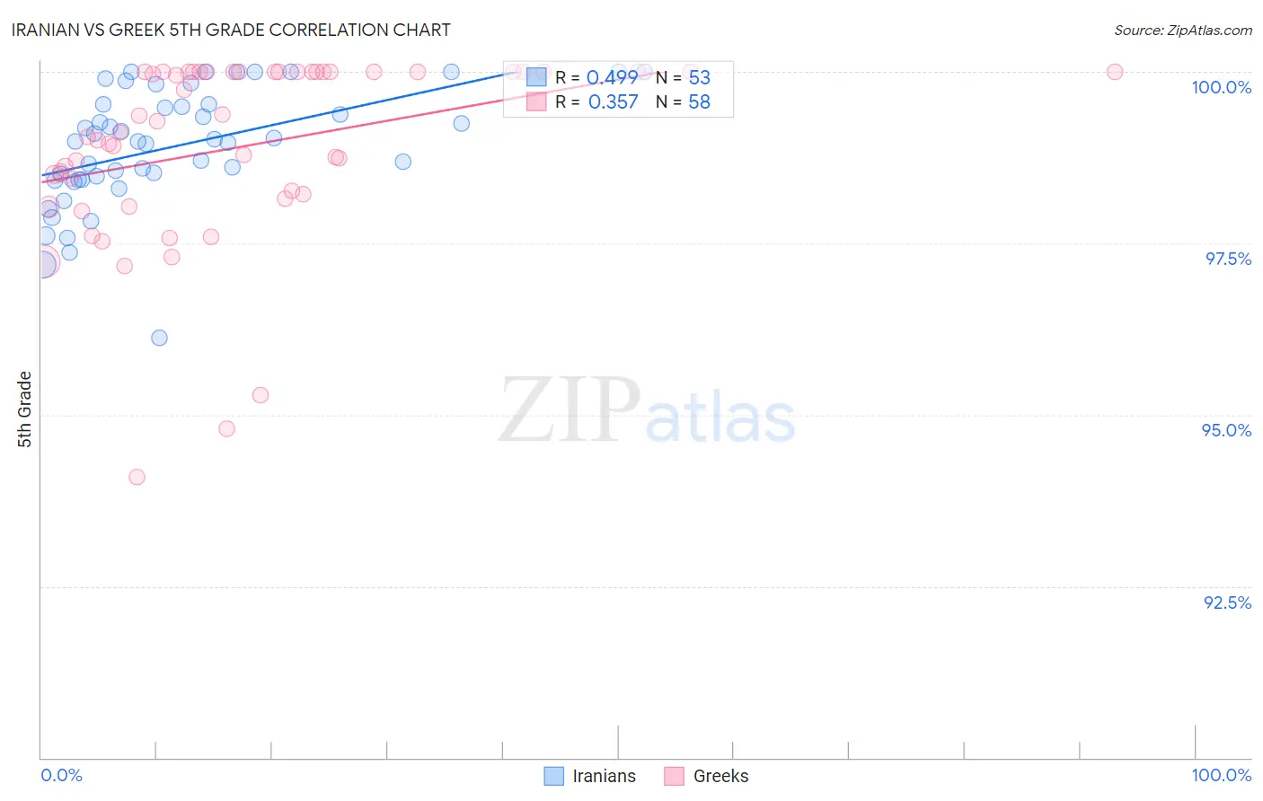 In terms of 5th grade, the demographic groups most similar to Iranians are Chickasaw (97.9%, a difference of 0.0%), Kiowa (97.9%, a difference of 0.010%), Macedonian (97.9%, a difference of 0.010%), Cajun (97.9%, a difference of 0.020%), and Cherokee (97.8%, a difference of 0.020%). Similarly, the demographic groups most similar to Greeks are Creek (98.0%, a difference of 0.0%), Austrian (97.9%, a difference of 0.0%), White/Caucasian (97.9%, a difference of 0.0%), Australian (98.0%, a difference of 0.010%), and American (97.9%, a difference of 0.010%).