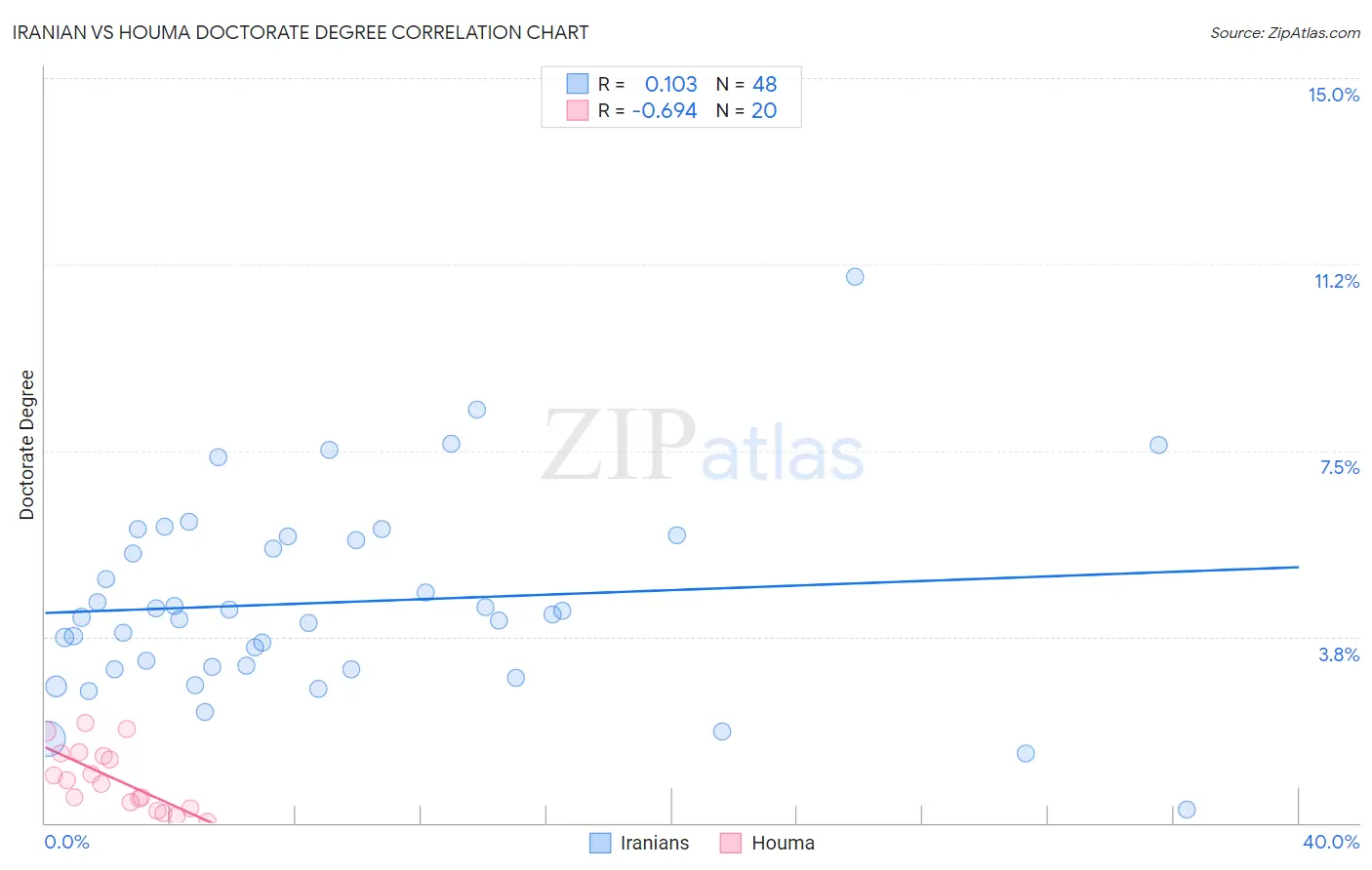 The statistical analysis conducted on geographies consisting of 315,770,820 people shows a poor positive correlation between the proportion of Iranians and percentage of population with at least doctorate degree education in the United States with a correlation coefficient (R) of 0.103 and weighted average of 3.1%. Similarly, the statistical analysis conducted on geographies consisting of 36,552,567 people shows a significant negative correlation between the proportion of Houma and percentage of population with at least doctorate degree education in the United States with a correlation coefficient (R) of -0.694 and weighted average of 0.96%, a difference of 228.5%.