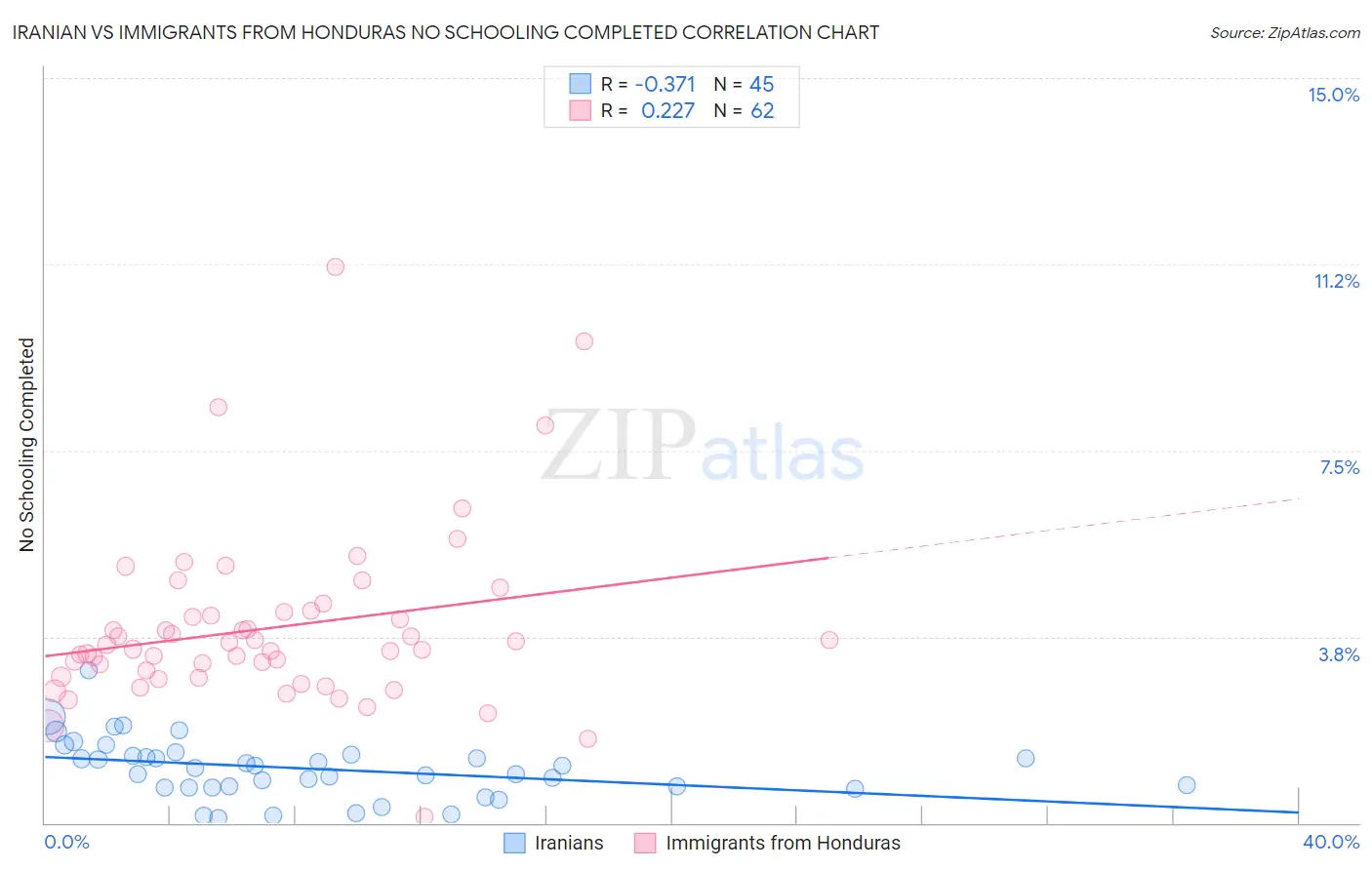 Iranian vs Immigrants from Honduras No Schooling Completed Correlation Chart