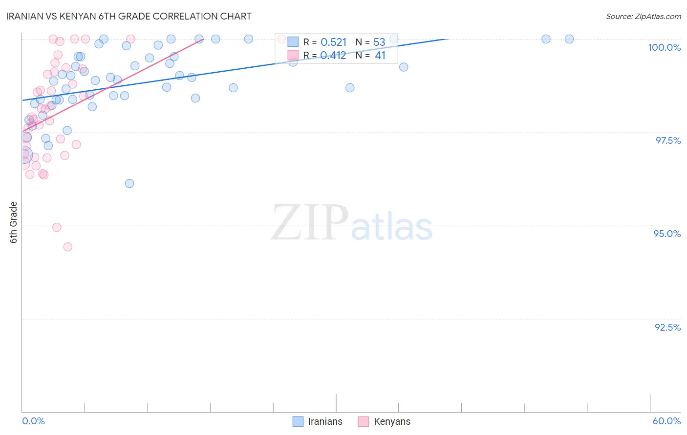 In terms of 6th grade, the demographic groups most similar to Iranians are Cajun (97.6%, a difference of 0.010%), New Zealander (97.7%, a difference of 0.020%), Kiowa (97.7%, a difference of 0.020%), Immigrants from Austria (97.7%, a difference of 0.020%), and Chickasaw (97.6%, a difference of 0.020%).