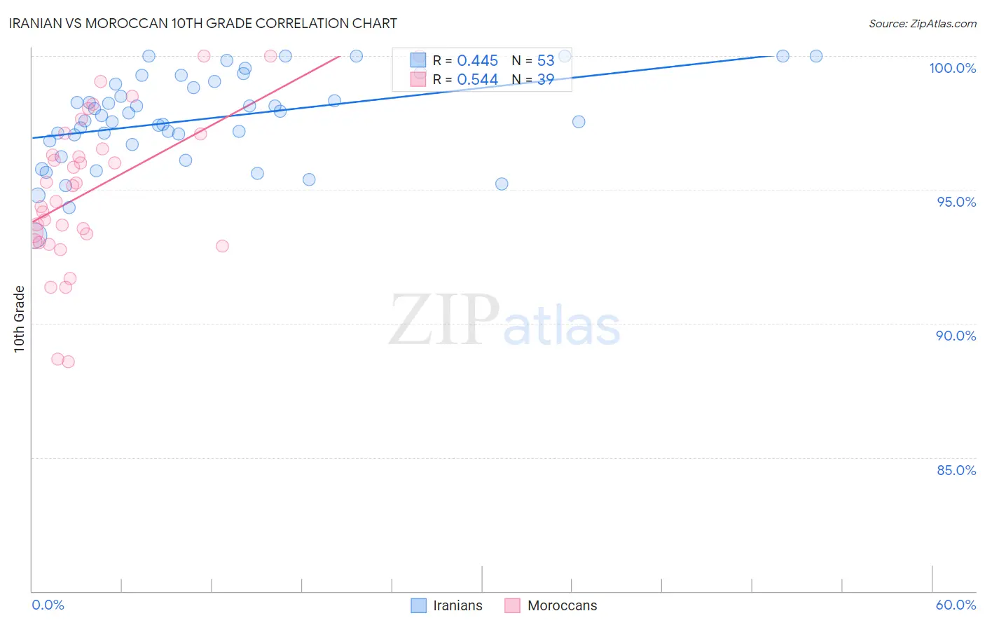 The statistical analysis conducted on geographies consisting of 310,636,461 people shows a moderate positive correlation between the proportion of Iranians and percentage of population with at least 10th grade education in the United States with a correlation coefficient (R) of 0.445 and weighted average of 95.3%. Similarly, the statistical analysis conducted on geographies consisting of 201,817,667 people shows a substantial positive correlation between the proportion of Moroccans and percentage of population with at least 10th grade education in the United States with a correlation coefficient (R) of 0.544 and weighted average of 93.5%, a difference of 1.9%.