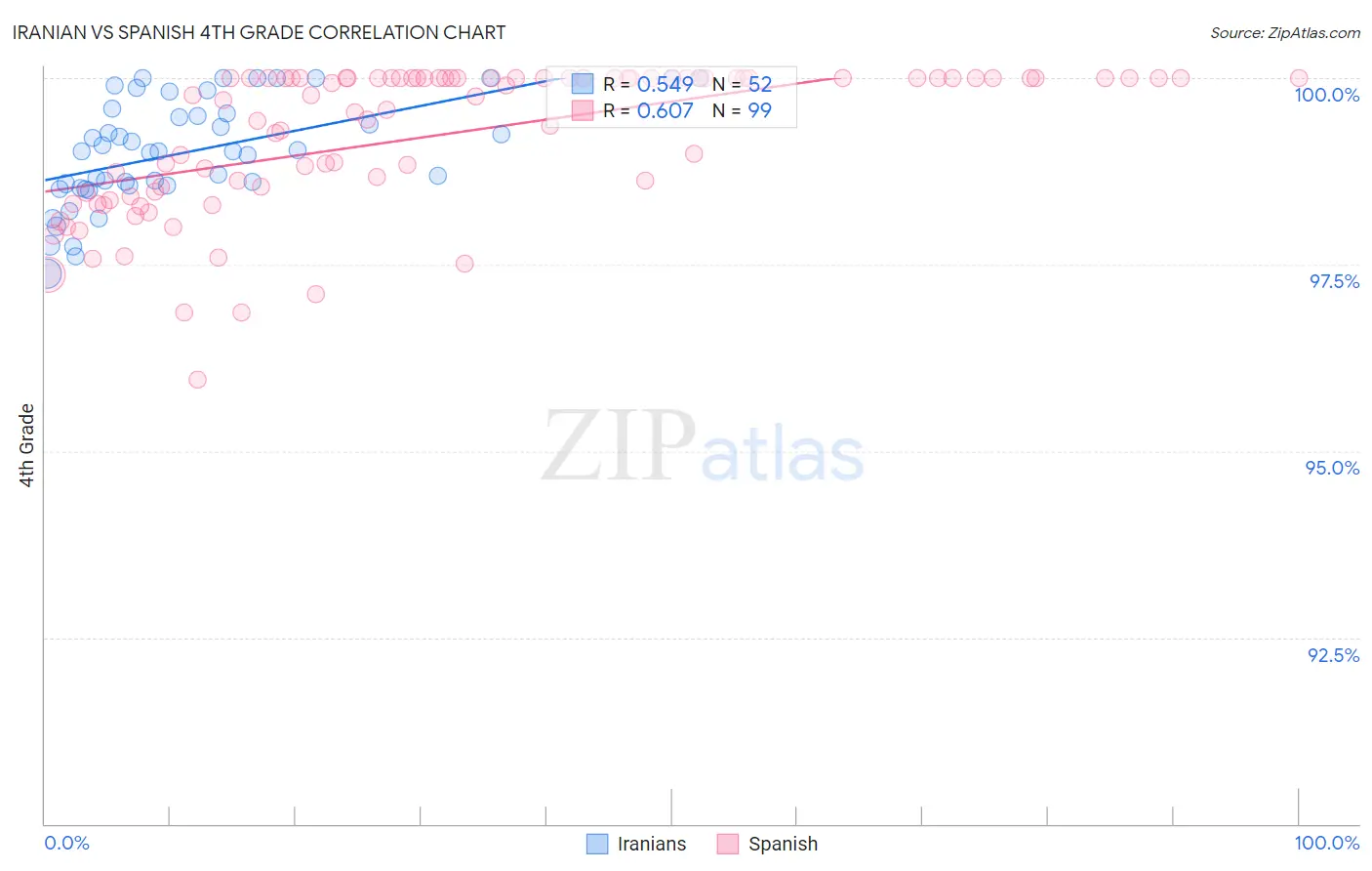 In terms of 4th grade, the demographic groups most similar to Iranians are Macedonian (98.0%, a difference of 0.0%), Chickasaw (98.0%, a difference of 0.010%), Immigrants from Netherlands (98.0%, a difference of 0.020%), Cherokee (98.0%, a difference of 0.020%), and Immigrants from Lithuania (98.0%, a difference of 0.020%).
