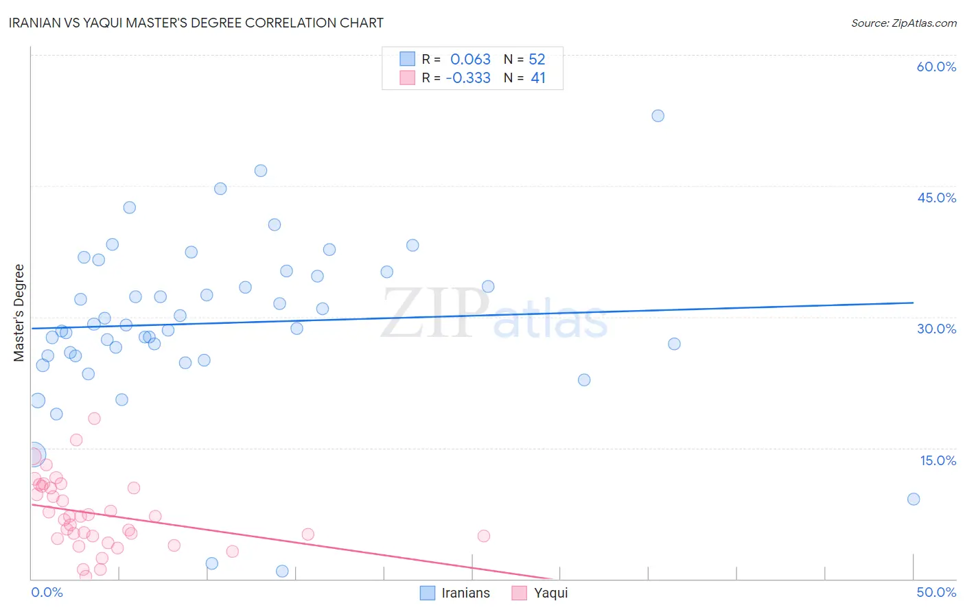 The statistical analysis conducted on geographies consisting of 316,817,608 people shows a slight positive correlation between the proportion of Iranians and percentage of population with at least master's degree education in the United States with a correlation coefficient (R) of 0.063 and weighted average of 22.3%. Similarly, the statistical analysis conducted on geographies consisting of 107,722,920 people shows a mild negative correlation between the proportion of Yaqui and percentage of population with at least master's degree education in the United States with a correlation coefficient (R) of -0.333 and weighted average of 11.0%, a difference of 102.2%.