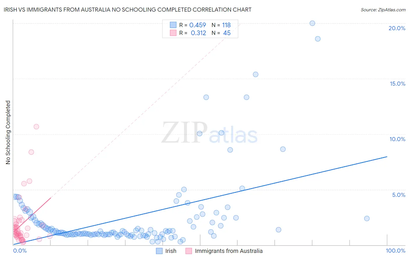 Irish vs Immigrants from Australia No Schooling Completed Correlation Chart