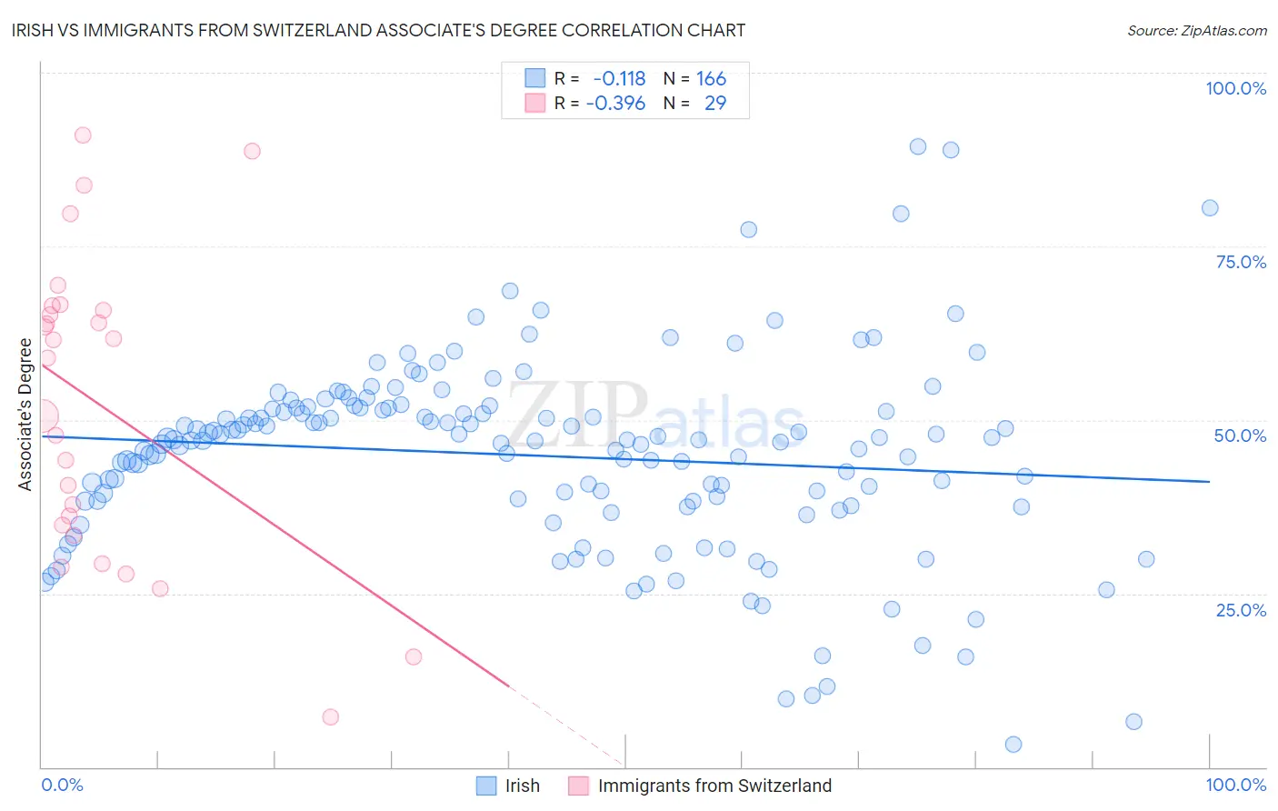 Irish vs Immigrants from Switzerland Associate's Degree Correlation Chart