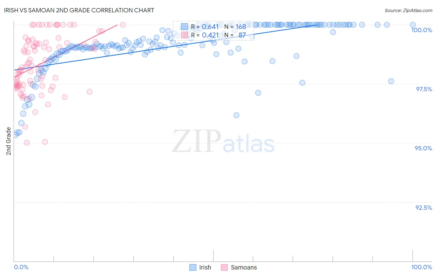 The statistical analysis conducted on geographies consisting of 580,708,963 people shows a significant positive correlation between the proportion of Irish and percentage of population with at least 2nd grade education in the United States with a correlation coefficient (R) of 0.641 and weighted average of 98.6%. Similarly, the statistical analysis conducted on geographies consisting of 225,201,431 people shows a moderate positive correlation between the proportion of Samoans and percentage of population with at least 2nd grade education in the United States with a correlation coefficient (R) of 0.421 and weighted average of 97.7%, a difference of 0.91%.