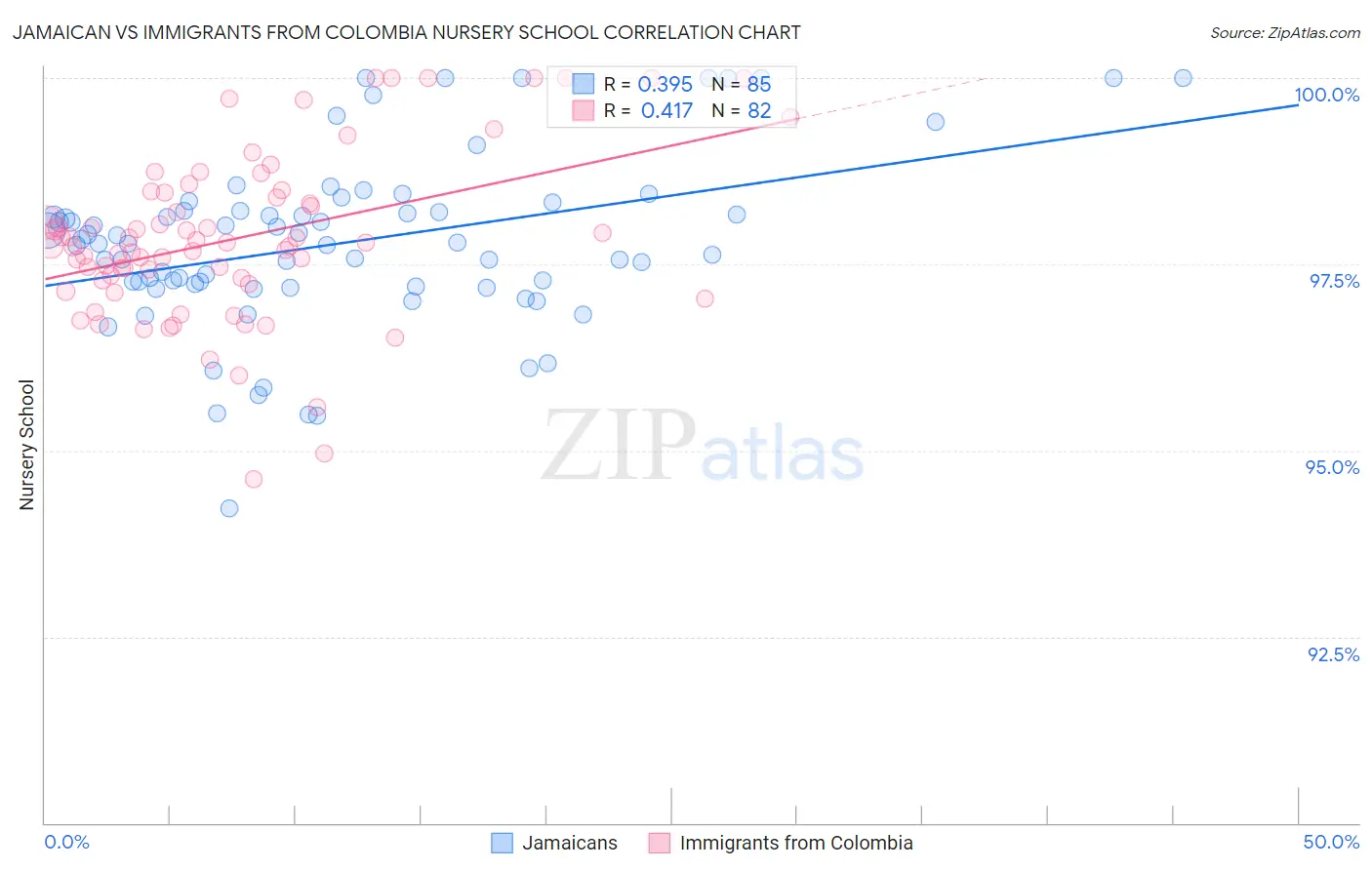 Jamaican vs Immigrants from Colombia Nursery School Correlation Chart