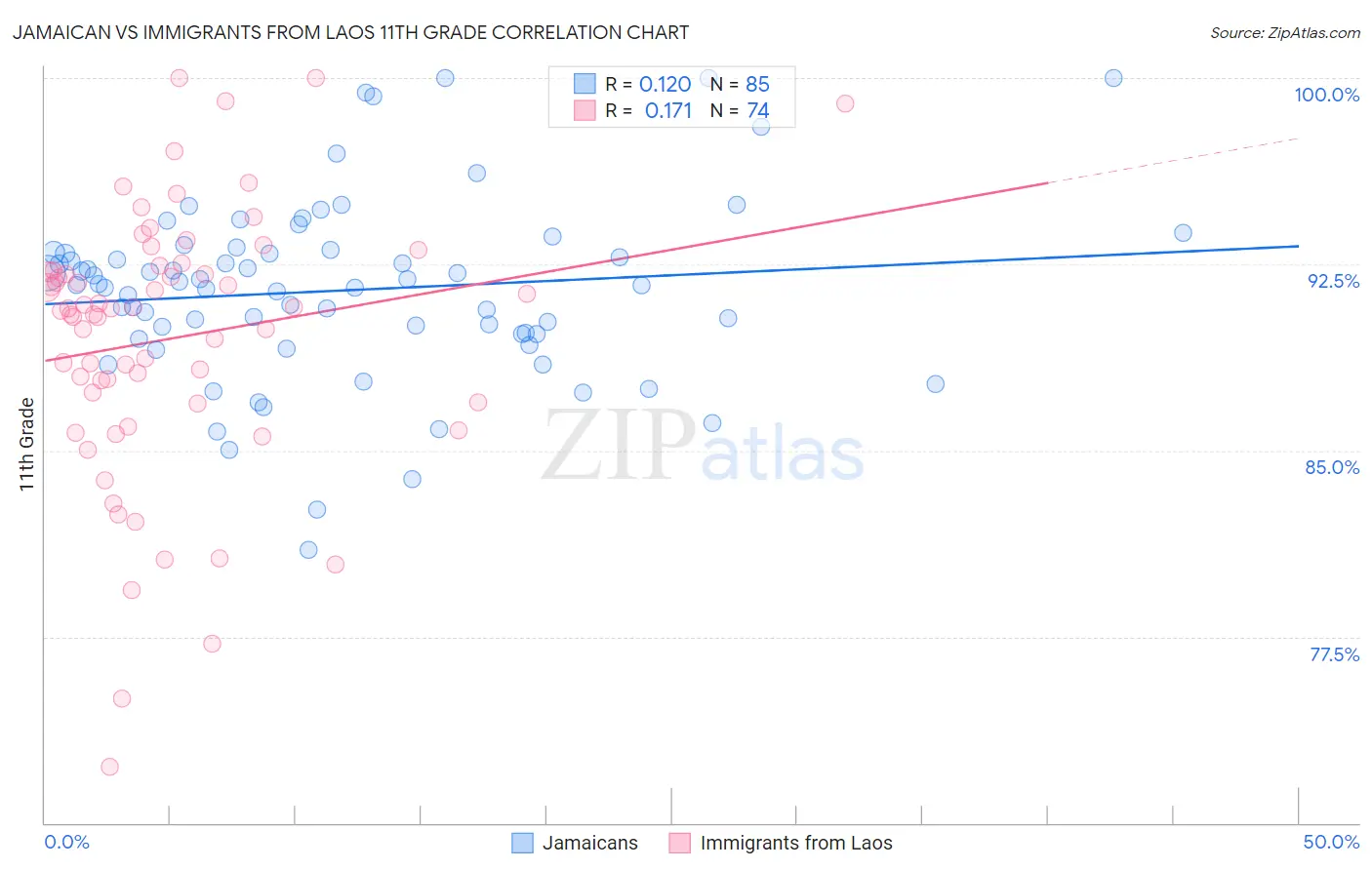 Jamaican vs Immigrants from Laos 11th Grade Correlation Chart