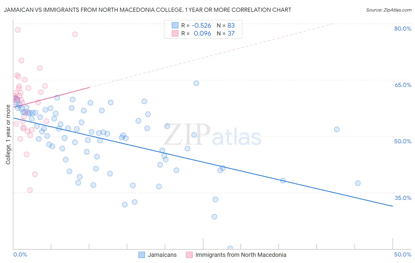 Jamaican vs Immigrants from North Macedonia College, 1 year or more Correlation Chart