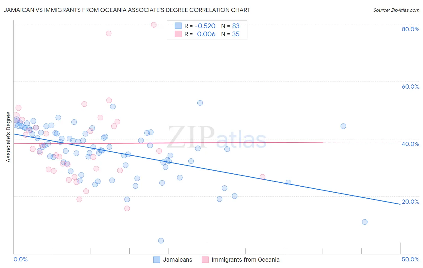 Jamaican vs Immigrants from Oceania Associate's Degree Correlation Chart