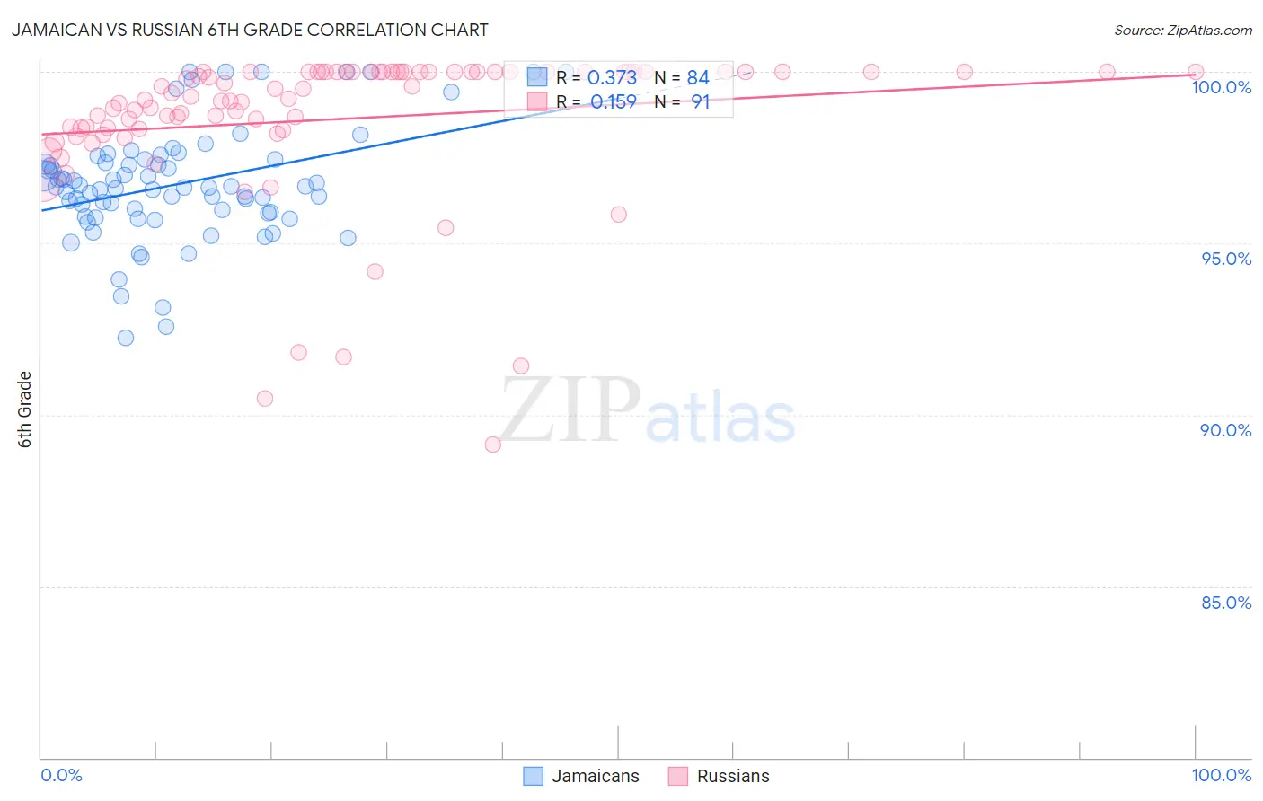 The statistical analysis conducted on geographies consisting of 368,084,189 people shows a mild positive correlation between the proportion of Jamaicans and percentage of population with at least 6th grade education in the United States with a correlation coefficient (R) of 0.373 and weighted average of 96.5%. Similarly, the statistical analysis conducted on geographies consisting of 512,259,047 people shows a poor positive correlation between the proportion of Russians and percentage of population with at least 6th grade education in the United States with a correlation coefficient (R) of 0.159 and weighted average of 97.7%, a difference of 1.3%.