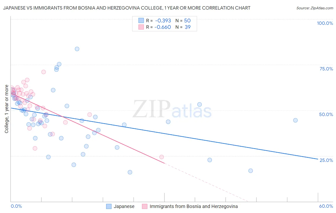 Japanese vs Immigrants from Bosnia and Herzegovina College, 1 year or more Correlation Chart
