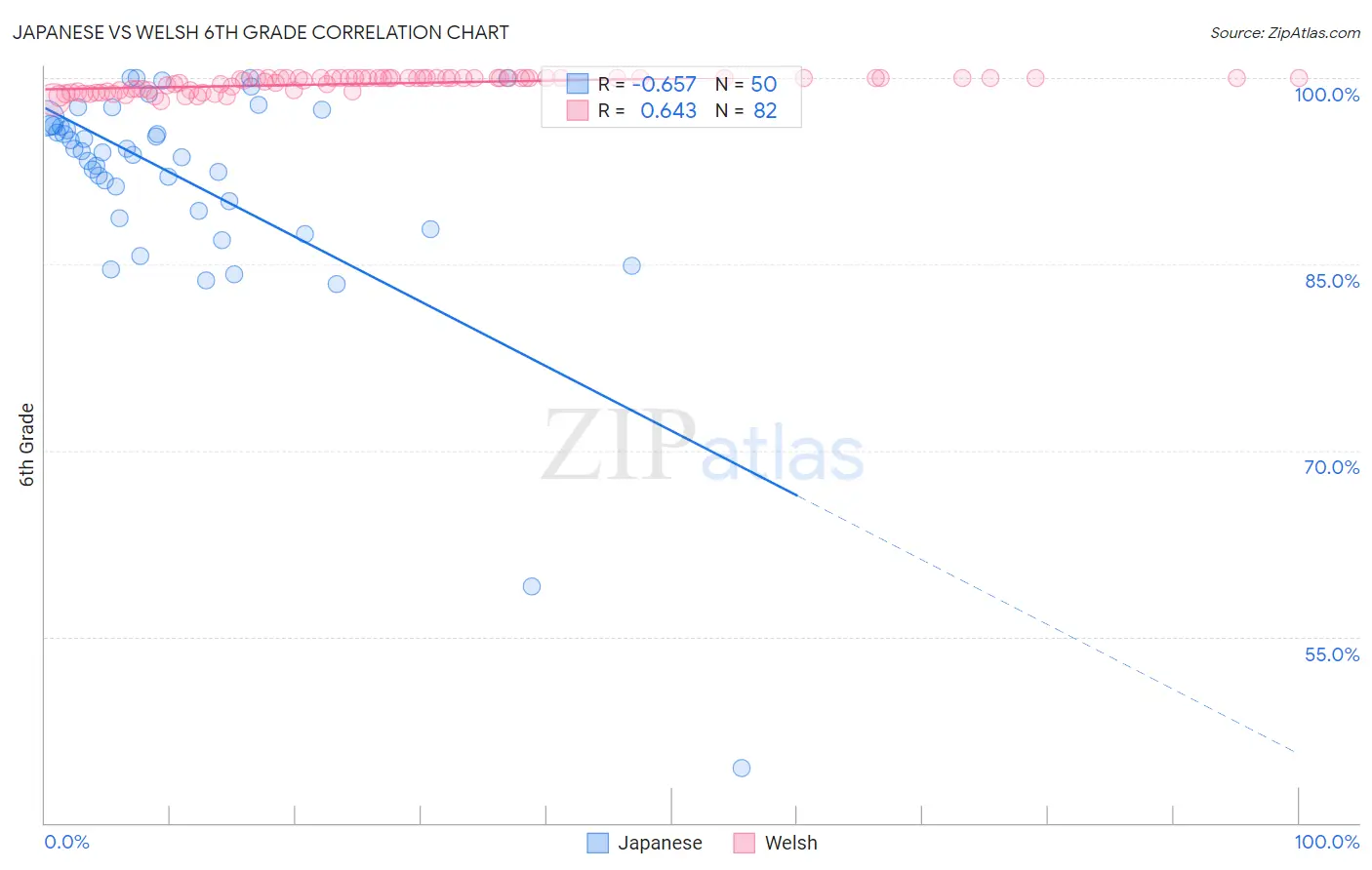 The statistical analysis conducted on geographies consisting of 249,183,224 people shows a significant negative correlation between the proportion of Japanese and percentage of population with at least 6th grade education in the United States with a correlation coefficient (R) of -0.657 and weighted average of 95.4%. Similarly, the statistical analysis conducted on geographies consisting of 239,959,962 people shows a significant positive correlation between the proportion of Welsh and percentage of population with at least 6th grade education in the United States with a correlation coefficient (R) of 0.643 and weighted average of 98.5%, a difference of 3.3%.