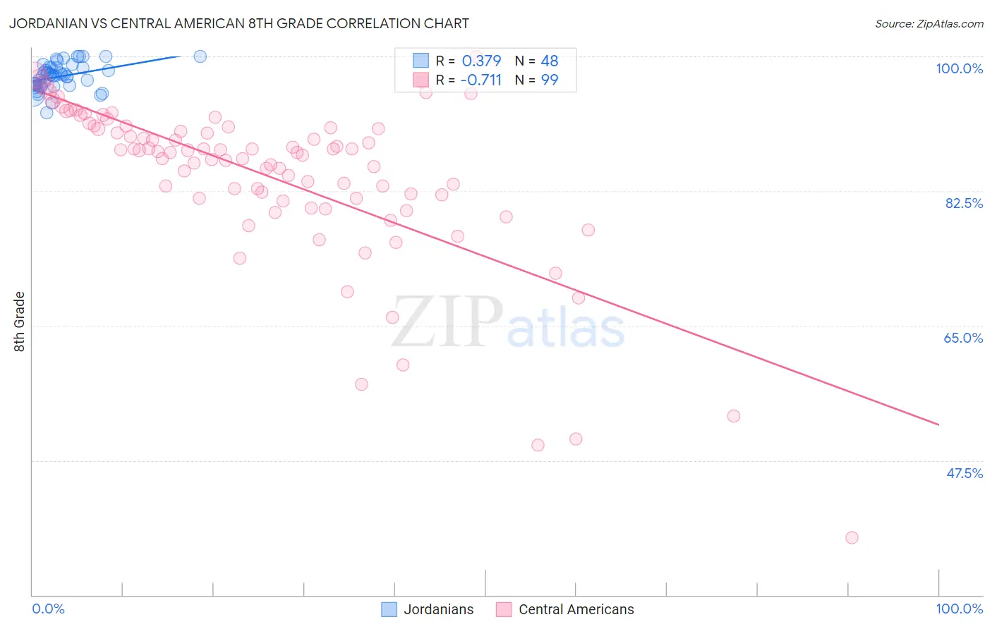 The statistical analysis conducted on geographies consisting of 166,403,553 people shows a mild positive correlation between the proportion of Jordanians and percentage of population with at least 8th grade education in the United States with a correlation coefficient (R) of 0.379 and weighted average of 96.1%. Similarly, the statistical analysis conducted on geographies consisting of 504,619,347 people shows a strong negative correlation between the proportion of Central Americans and percentage of population with at least 8th grade education in the United States with a correlation coefficient (R) of -0.711 and weighted average of 91.6%, a difference of 4.9%.
